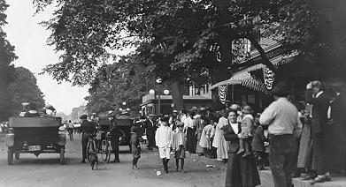 parade. The 1-story business beyond is Magnell Brothers Drug Company. Main street is a dirt thoroughfare now and horseless