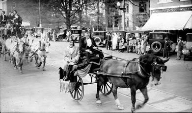 Shriners in parade. The procession passes the Eldridge Homestead and the New York Market. Today the